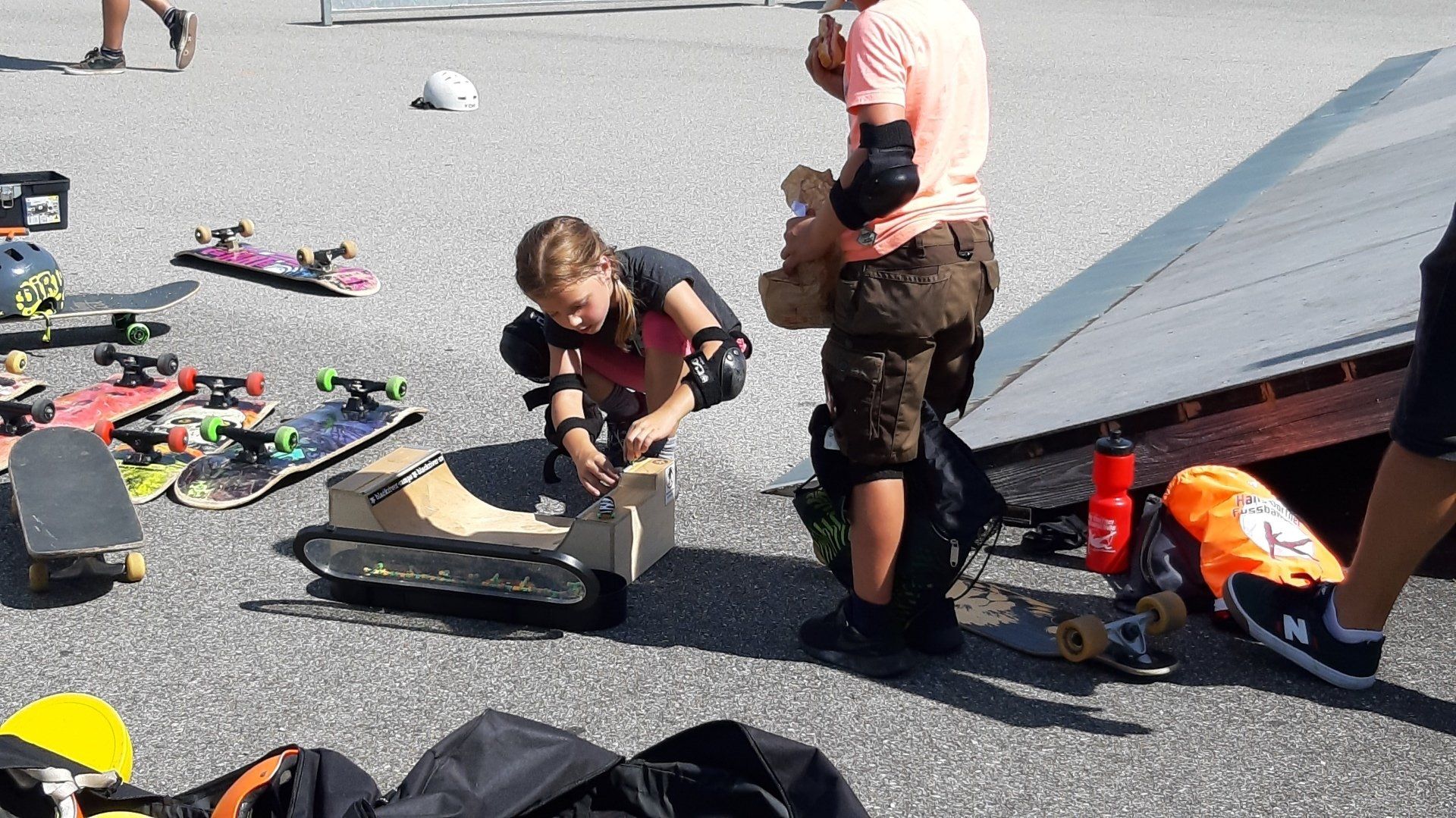 Wegen des heißen Wetters wurden zwischendurch viele Trinkpausen gemacht, in denen die Kinder auch die Möglichkeit hatten, mit den Fingerboards auf der Minirampe zu fahren.
